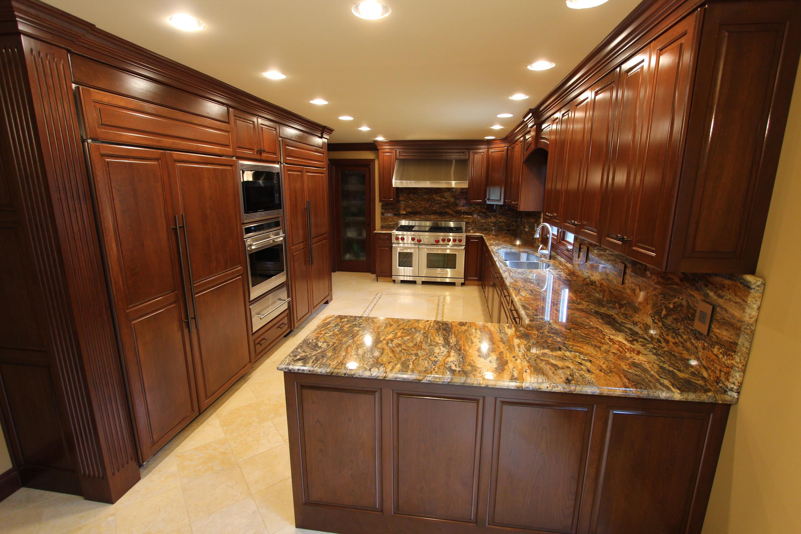 At one side of the wall is a full height pantry storage cabinet with built in refrigerator and oven tower. The top 5 granite countertops to pair with cherry cabinets include.